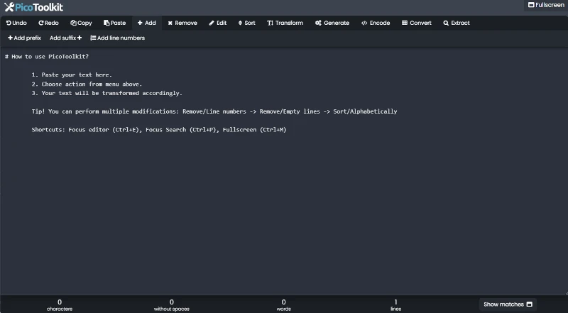 PicoToolkit is your Swiss Army knife for working with text, lists and data exports – from quick clean-ups to preparing content for newsletters, shops and apps.